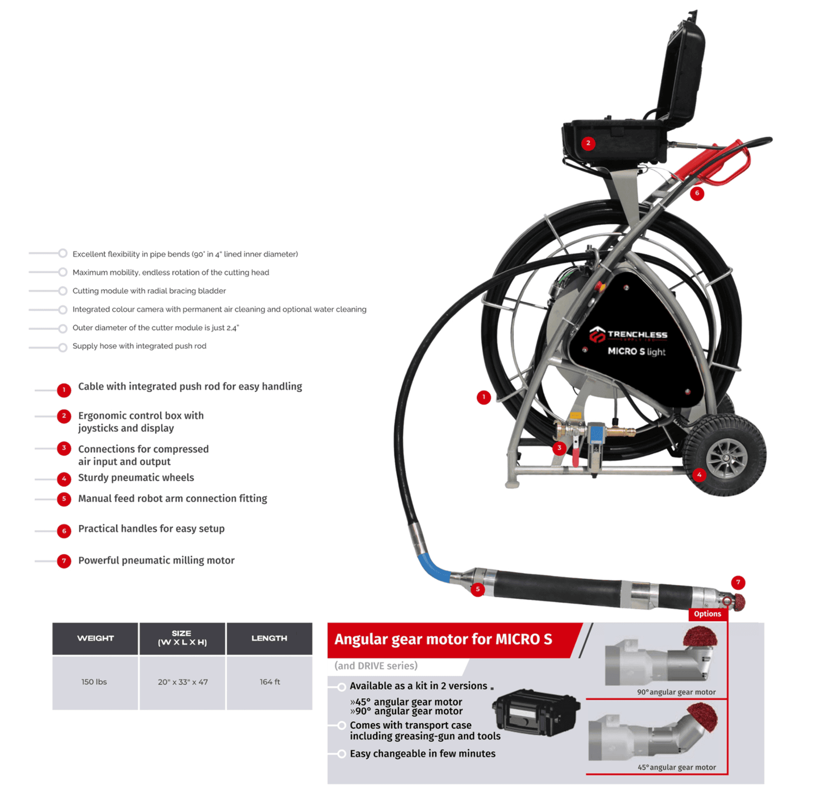 The cutter head runs on 30CFM @140PSI, which makes the head speed run at over 10k RPMs. Easily change cutter bits in under 30 seconds, with different bits for cutting concrete, pipe, foreign objects, and liner.